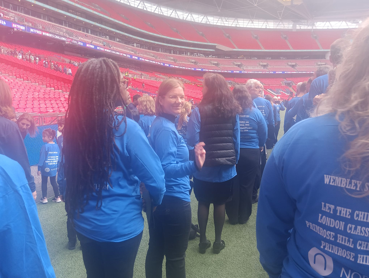 The event we performed at was the Women’s Rugby Challenge Cup Finals. We were singing three songs in the halftime show. We had lots of practice, therefore I knew the music by heart. Thus, during the live performance I could fully focus on the conductor, and concentrate on the backing track. This helped me to follow the beat as closely as the acoustics of the Wembley allowed. There was a lot of reverb, which did not make our job easy at all.